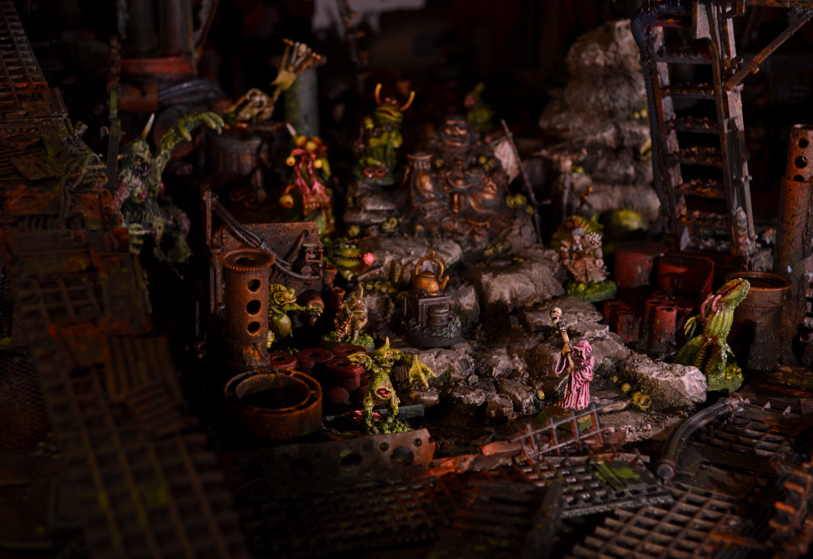 Then there is the Great Unclean One made out of papier-mâché, grains of sand and horns sharpened from plastic sprue in the late 90s'. More recently made ones include kitbashed cultists and Plaguebearers. Scratch built Beast of Nurgle and more Plagubearers loom in the shadows as well.