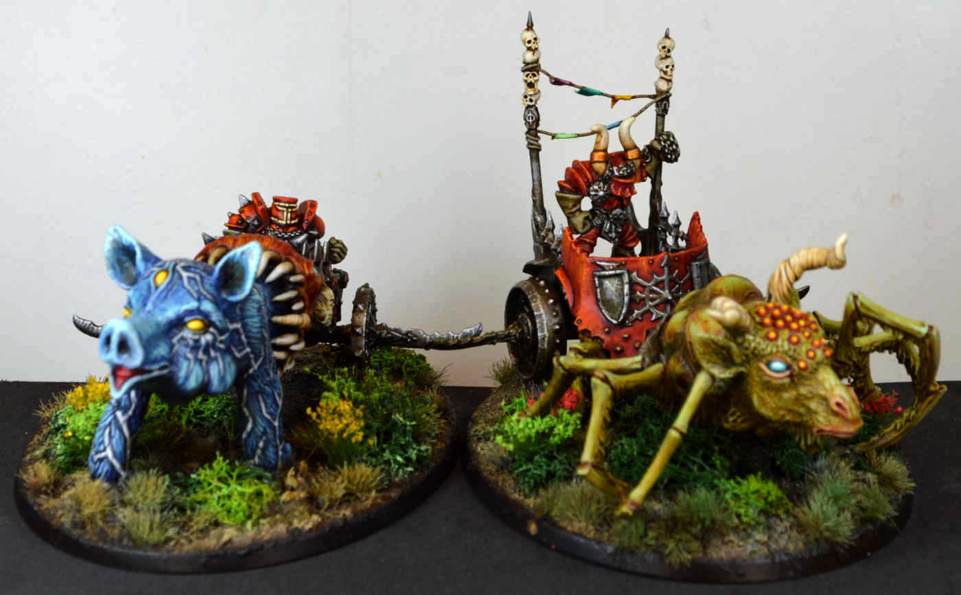 Here's a few WIP shots from the last week or so. I got four units of 10 Plaguebearers each kitbashed and converted. Then I did quite a bit of sculpting on them to get all those mismatched bits fit in seamlessly. Added in many buboes, pustules and hanging bellies. Also of note is that most of the hands, swords etc. were first glued in very close to their bodies and/or hanging down (rather than heroically waving around skywards), then the gaps between sculpted shut. This gives many of the miniatures droopy and sullen look, very withdrawn and passive. I think this suits the army's theme quite well, and is also a nod towards the aesthetics of old sculpted miniatures, back when the limitations of molding and casting of metal miniatures had a huge impact on their visuals too.
